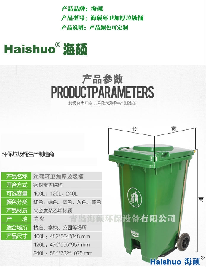 產(chǎn)品名稱:海碩環(huán)衛(wèi)加厚垃圾桶 ,240L環(huán)保塑料垃圾桶、戶外塑料垃圾箱、青島掛車?yán)皬S家