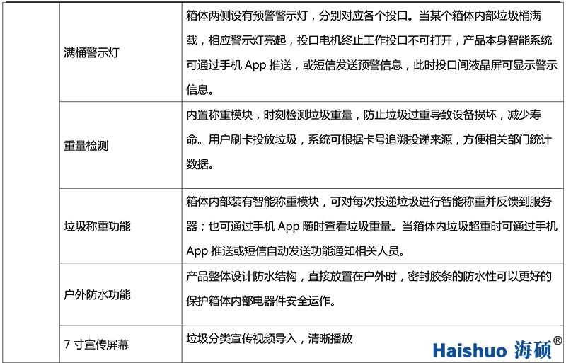 溫度檢測(cè)功能、定位功能、滿載警示預(yù)警、戶外防水、掃碼投遞裝置、垃圾稱重功能、自動(dòng)投口防夾手。