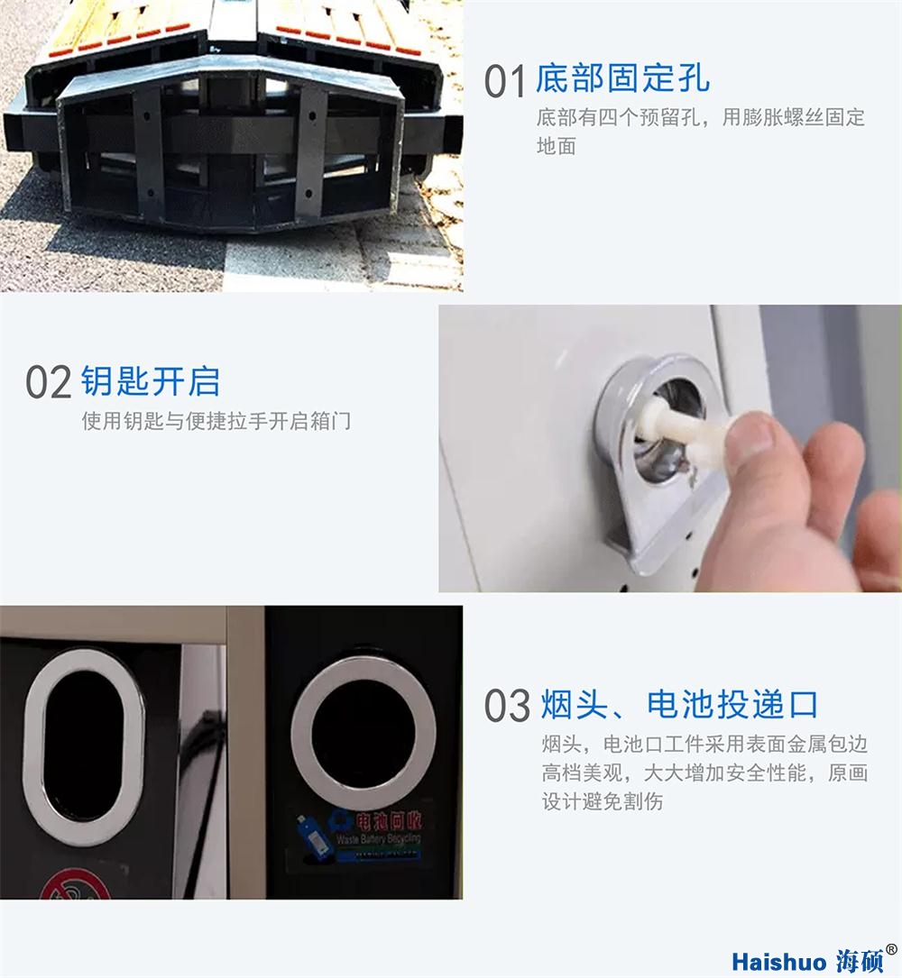 詳細(xì)說明:青島海碩戶外分類果皮箱HS-02A,是青島海碩環(huán)保設(shè)備有限公司為青島等地安裝的分類果皮箱,材質(zhì)為鍍鋅板。果皮箱表面涂料均勻光滑,同時(shí)個(gè)性化設(shè)計(jì),使用方便、實(shí)用,美觀大方,適合小區(qū)、景區(qū)等戶外場所使用。