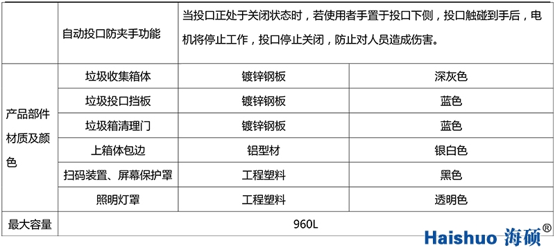 溫度檢測(cè)功能、定位功能、滿載警示預(yù)警、戶外防水、掃碼投遞裝置、垃圾稱重功能、自動(dòng)投口防夾手。