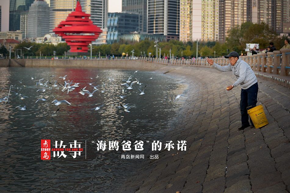 今年是孫方成喂海鷗的第三年,每天早晨喂海鷗,晚上去餐館收剩菜剩飯,成了這位退休老人最重要的事。孫方成說,最多的時候每天能有一千多只海鷗來這吃“早飯”,能吃掉200多斤糧食。在五四廣場,很多人都知道孫方成,他們半開玩笑地叫他“海鷗爸爸”。