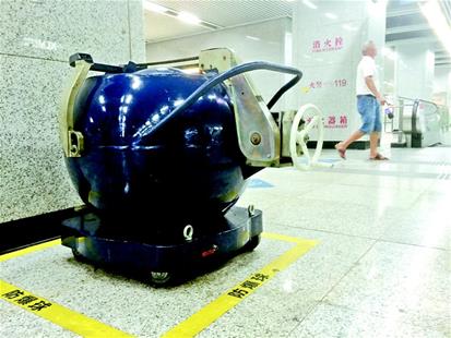 昨日上午11時許,楚天都市報記者在王家灣地鐵站看到,重達750kg的防爆球披著藍色外衣,球體一側寫有醒目的“防爆球”字樣,另一側則安裝了一個可以轉動的方向輪盤,從外形上看,很容易就能分辨出這并不是垃圾桶。除此之外,地鐵站工作人員用黃色警示線將防爆球所在區(qū)域單獨分隔開來。