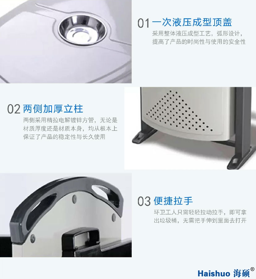 戶外分類垃圾桶款式雖是多種多樣的,但在青島街道上最常見的戶外分類垃圾桶是銀色鍍鋅板沖孔式垃圾桶,與我公司生產(chǎn)的電解鍍鋅垃圾桶HS-01小款,HS-02大款相同,而這兩款戶外分類垃圾桶也正是我公司最暢銷的兩款垃圾桶。